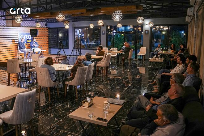 اللغوي والمحاضر في الندوة نيجرفان عبدالعزيز، يتحدث عن محاور الندوة، والشاعر حسن بافي رامان أحد المشاركين والحضور يشرح مدى أهمية تنظيم أنشطة مماثلة، وشيركو دقوري، منسق الأنشطة في "آرتا كافيه" يوضح أهداف هذه الندوة.